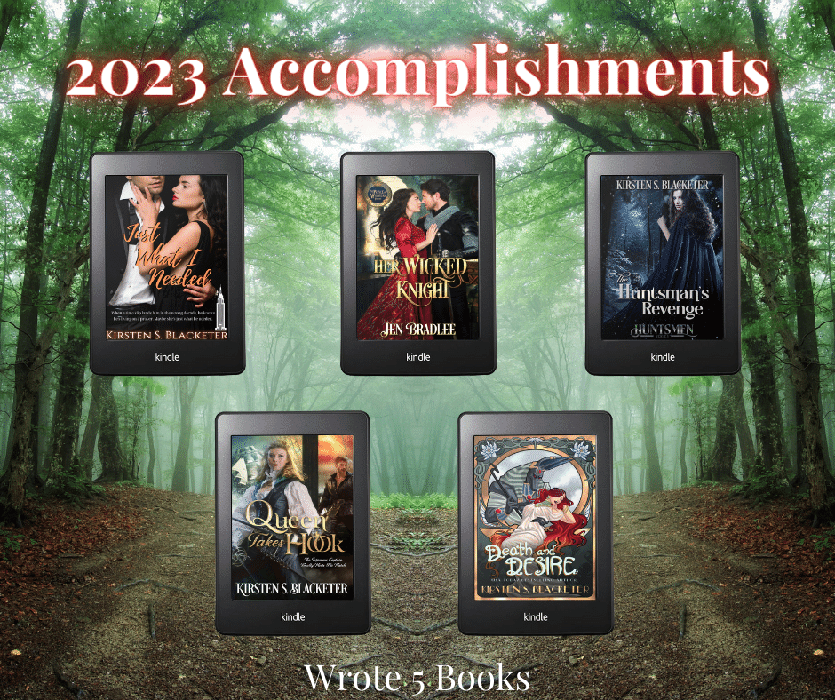 Even in a year of transition, I somehow maintained my muse and stuck to the writing and publishing goals I set back in January! Over the course of 2023, I wrote five novels and published five novels. I had hoped to write six, but I gave myself some grace after I lost my grandfather in September and started a new job.