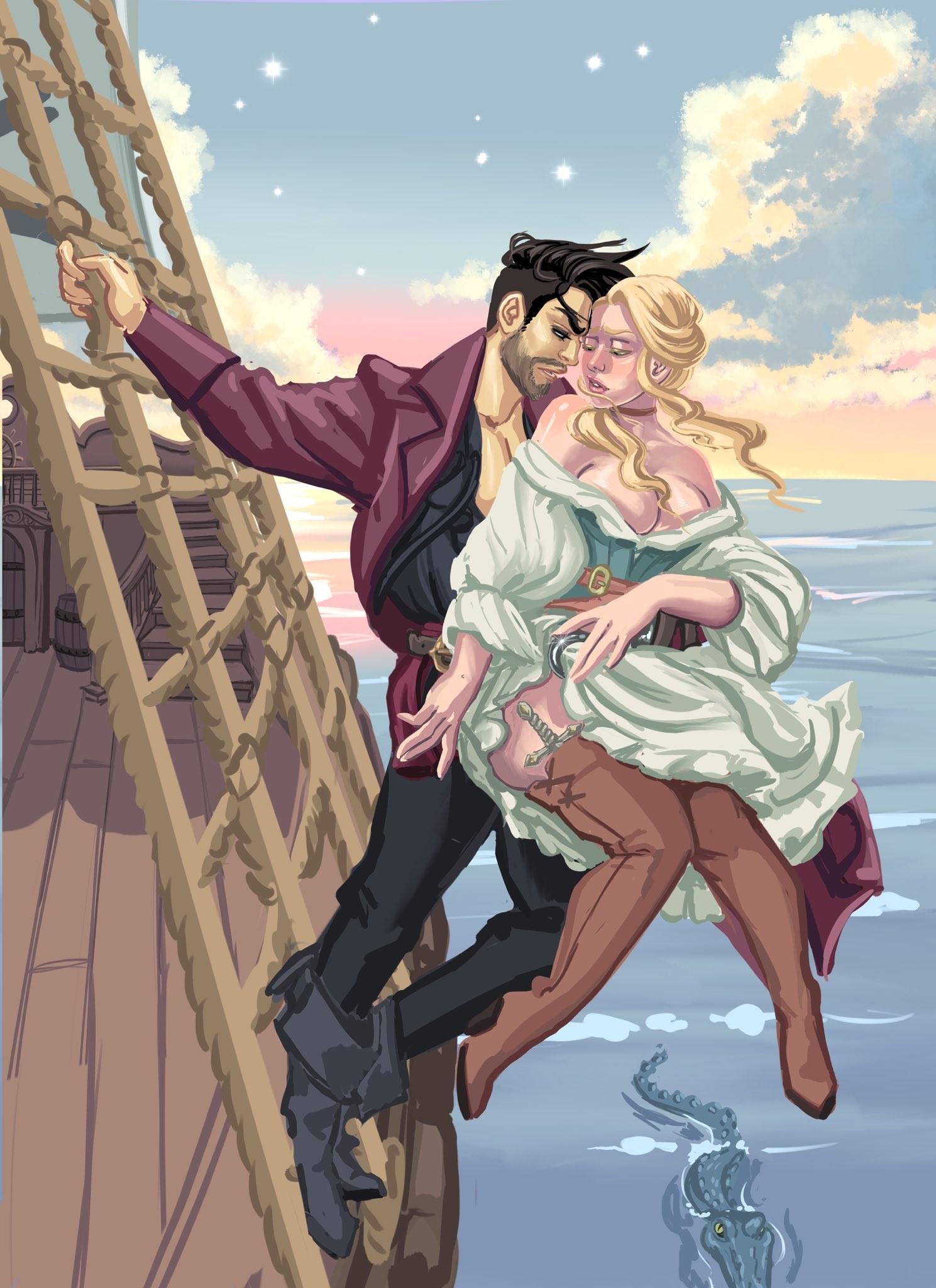 As a little bonus, I commissioned Phantom Dame, an artist I love, to paint me a little bodice ripper portrait of my characters in celebration of their upcoming book. Here is Captain James Hook and Princess Celeste in all their swashbuckling glory. You’ll get a print to go with your signed copy of the book when it releases on April 23rd if you buy it directly from me!