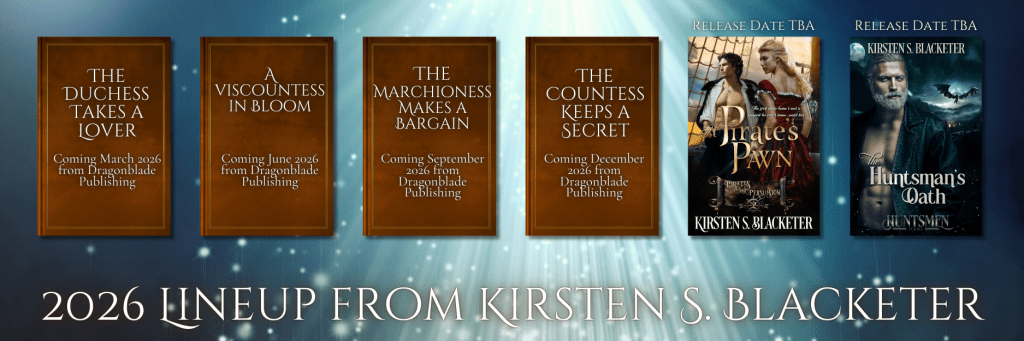 I’ll also be self-publishing two books (Heaven willing) in 2026. A Pirate’s Pawn will continue the legacy of the Pirates and Persuasion Series with Mr. Smee and Madame Tinker’s story. The Huntsman’s Oath will expand on the Huntsmen Series by exploring more of the Animus’ history through Garoth’s search for love and redemption. I fully intend to add another book to the Huntsmen Series (the Alchemist *wink*) and two more books to Pirates and Persuasion (think silver fox pirates altered by love.) But you’ll be waiting a little for those.