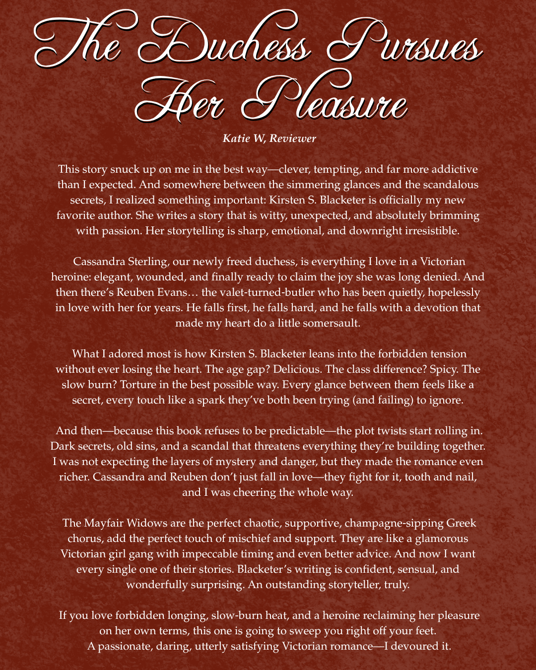 Release day went well for The Duchess Pursues Her Pleasure. It’s had a warm welcome from historical romance readers, and the reviews are overwhelmingly positive! Thank you so much for reading and sharing my Wanton Widows. Cassandra and Reuben are only the beginning.